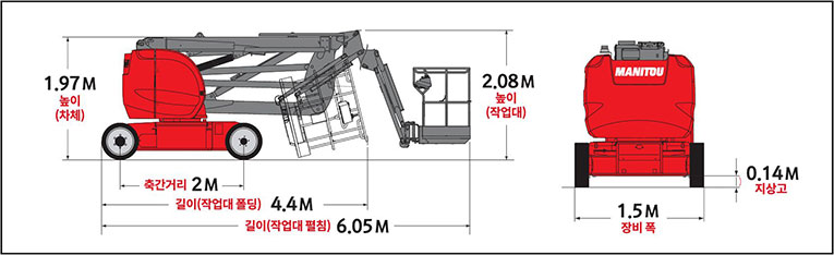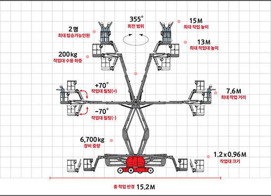 국내 굴절식 고소작업대 시장의 가장 표준형 모델(최대작업높이 15m)로서 제조공장, 공항, 쇼핑몰, 플랜트 시공 등 거의 모든 시설보수공사 현장에서 훌륭한 범용성과 최고의 작업 효율성을 보장합니다
